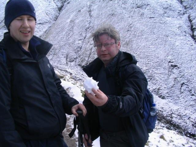 15mins later they were running down through thick snow with very tired limbs, great! The paths were hard to make out so they went ‘as the crow flies’ BIG MISTAKE!! Ending up at the top of an ice sheet, Phil lost his footing and slid down about 40ft with no control, shit his pants, luckily hit a rock and grabbed another which stopped him, in front was a big rocky stretch and a certain drop to dead fat bloke! Brian, in his wisdom followed Phil, and slid down on his arse, out of control; luckily he hit Mr Atkins, a rock and stopped. A bit of swearing then ensued; followed by firm handshakes and an agreement to stick to what looked like a track.