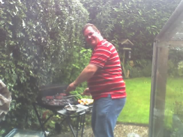 The weather had held out for 2 hours of cricket so it was back to Sim & Di's for the BBQ - the usual fine fare was on offer washed down with plenty of grog, however the rain did not hold off with Chap completing the cooking in the pouring rain. However with large garden brollies, awnings and patio heaters we survived the day and lasted until 10.30 pm when it was time to catch the train back to Brum.
